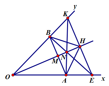 c) Qua \(H\) kẻ đường thẳng song song với \(AB\) cắt \(Ox\) tại \(E\) cắt \(Oy\) tại \(K\). Chứng minh \(OH\) là đương trung trực của \(EK\).