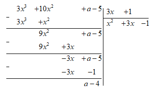 Tính giá trị của \(a\) để đa thức \(A\left( x \right) = 3{x^3} + 10{x^2} + a - 5\) chia cho đa thức