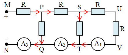 Cho mạch điện như hình vẽ, trong đó, ba ampe kế \({A_1},\,\,{A_2},\,\,{A_3}\) có cùng điện trở \({R_A}\), các điện trở R có cùng giá trị. Biết rằng ampe kế \({A_1}\) chỉ 0,2 A, \({A_2}\) chỉ 0,8 A. Hỏi ampe kế \({A_3}\) chỉ bao nhiêu?