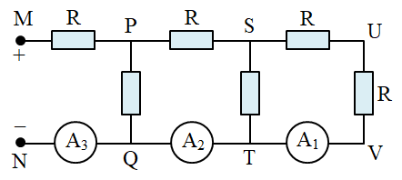 Cho mạch điện như hình vẽ, trong đó, ba ampe kế \({A_1},\,\,{A_2},\,\,{A_3}\) có cùng điện trở