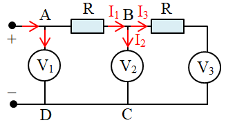 Các vôn kế giống nhau được mắc vào mạch điện như hình vẽ. Vôn kế \({V_1}\) chỉ 10 V; \({V_3}\) chỉ 8 V. Vôn kế \({V_2}\) chỉ bao nhiêu?
