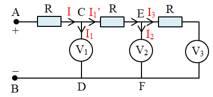 Cho mạch điện như hình vẽ, trong đó ba điện trở có cùng giá trị R và ba vôn kế có cùng