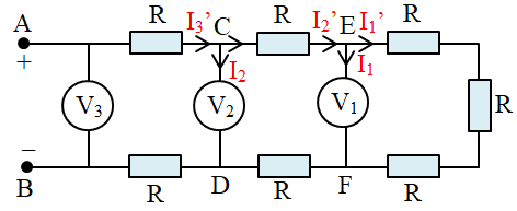 Cho mạch điện như hình vẽ, trong đó ba vôn kế \({V_1},\,\,{V_2},\,\,{V_3}\) có cùng điện trở \({R_V}\), các điện trở R có cùng giá trị R. Biết rằng số chỉ của hai vôn kế \({V_1},\,\,{V_2}\) là \({U_1}\) và \({U_2}\). Tìm số chỉ vôn kế \({V_3}\) theo \({U_1}\) và \({U_2}\). Cho \({U_2} = n{U_1}\), suy ra \({U_3}\) theo n và \({U_1}\). Áp dụng với \({U_1} = 6\,\,V;\,\,{U_2} = 24\,\,V\).