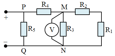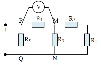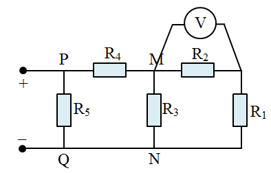 Cho mạch điện như hình vẽ. Các điện trở có giá trị như nhau và bằng R. Khi dùng một vôn kế