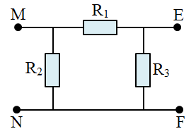 Cho mạch điện như hình vẽ. Khi đặt M và N vào hiệu điện thế không đổi \({U_{MN}} = 50\,\,V\) thì người ta đo được \({U_{EF}} = 30\,\,V\) và cường độ dòng điện qua \({R_2}\) là \({I_2} = 0,5\,\,A\). Khi đặt E và F vào hiệu điện thế không đổi \({U_{EF}} = 30\,\,V\) thì người ta đo được \({U_{MN}} = 10\,\,V\). Hãy tính \({R_1},\,\,{R_2}\) và \({R_3}\).