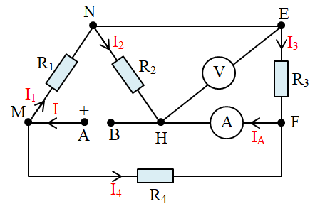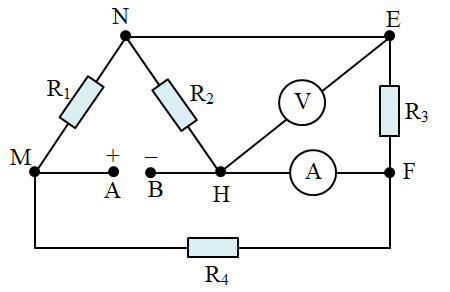 Cho mạch điện như hình vẽ. Biết \({R_1} = 20\,\,\Omega \); \({R_2} = 15\,\,\Omega \); \({R_3} = 30\,\,\Omega \); \({R_4} = 20\,\,\Omega \); \({U_{AB}} = 60\,\,V\). Các dụng cụ đo lí tưởng, bỏ qua điện trở của dây nối.