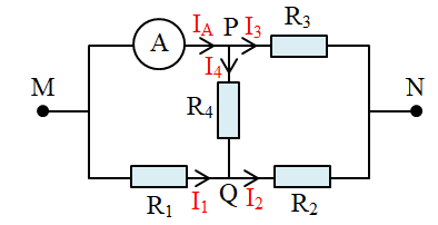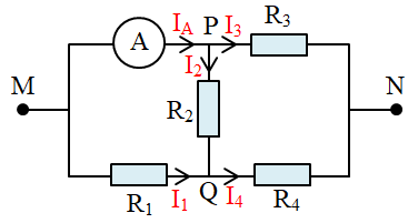 Cho mạch điện như hình vẽ, biết: \({R_1} = {R_2} = 12\,\,\Omega \); \({R_3} = {R_4} = 24\,\,\Omega \), ampe kế có điện trở không đáng kể.