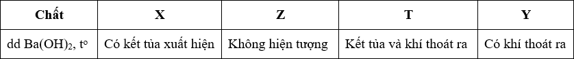 X, Y, Z, T là một trong các dung dịch sau: (NH4)2SO4, K2SO4, NH4NO3, KOH. Thực hiện thí nghiệm để
