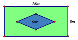 Một công viên thiết kế hồ nước hình thoi có diện tích \(6{m^2}\). Để an toàn cho mọi người đến tham quan hồ nước, công ty đã trồng bãi cỏ xung quanh hồ nước được bao quanh là hình chữ nhật với kích thước như hình vẽ sau: