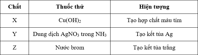 Kết quả thí nghiệm của các chất X, Y, Z với các thuốc thử được ghi ở bảng sau: Các chất