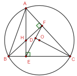 Cho tam giác \(ABC\) có ba góc nhọn nội tiếp trong đường tròn \(\left( {O;R} \right)\) và hai đường cao \(AE,BF\) cắt nhau tại \(H\)(\(E \in BC,F \in AC\)).