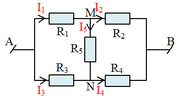 Cho mạch điện như hình vẽ: \({R_1} = 1\,\,\Omega \); \({R_2} = 1\,\,\Omega \); \({R_3} = 2\,\,\Omega \); \({R_4} = 3\,\,\Omega \); \({R_5} = 4\,\,\Omega \); \({U_{AB}} = 5,7\,\,V\). Tính cường độ dòng điện qua các điện trở và điện trở tương đương của mạch cầu.