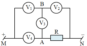 Cho mạch điện như hình vẽ, trong đó 4 vôn kế giống hệt nhau, điện trở không lớn lắm. Vôn