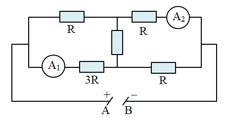 Trong sơ đồ mạch điện như hình vẽ, ampe kế \({A_1}\) chỉ giá trị \({I_1}\). Hỏi ampe kế \({A_2}\) chỉ bao nhiêu? Bỏ qua điện trở của ampe kế và dây nối.