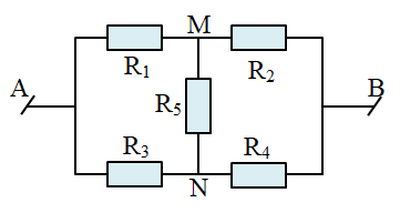 Cho mạch điện có sơ đồ như hình sau đây: \({R_1} = 1\,\,\Omega \); \({R_2} = 0,4\,\,\Omega \); \({R_3} = 2\,\,\Omega \); \({R_4} = 6\,\,\Omega \); \({R_5} = 1\,\,\Omega \); \({U_{AB}} = 6\,\,V\). Tính cường độ dòng điện qua mỗi điện trở và điện trở tương đương của đoạn mạch.