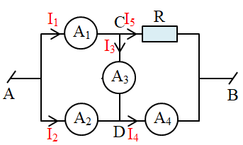 Cho mạch điện như hình, các ampe kế có cùng điện trở \({R_A}\). Biết ampe kế \({A_1}\) chỉ 3 A, \({A_2}\) chỉ 4 A.