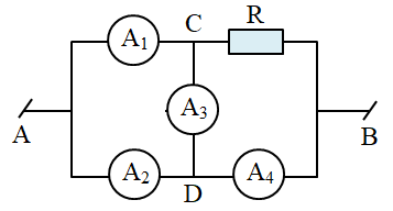 a) Tìm số chỉ ampe kế \({A_3},\,\,{A_4}\) và cường độ dòng điện qua R.