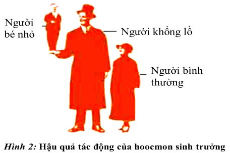 Hình 2 minh họa 3 trường hợp người: người bình thường, người bé nhỏ và người khổng lồ. Hãy chỉ ra trường hợp nào là do tuyến yên sản xuất ra quá ít hoocmôn sinh trưởng vào giai đoạn trẻ em. Tại sao tuyến yên sản xuất ra quá ít hoocmôn sinh trưởng vào giai đoạn trẻ em lại gây ra hậu quả như vậy?