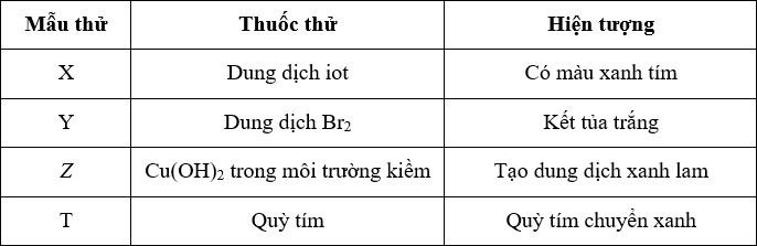 Kết quả thí nghiệm của các chất X, Y, Z, T với một số thuốc thử được ghi ở bảng sau:Các