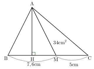 Tính diện tích hình tam giác ABC (như hình vẽ) biết diện tích hình tam giác AMC là \(34cm^2\).