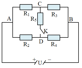 Cho mạch điện như hình vẽ. \({R_1} = 4\,\,\Omega \); \({R_2} = 2\,\,\Omega \); \({R_3} = 8\,\,\Omega \); \({R_5} = 10\,\,\Omega \); \(U = 12\,\,V\). Điện trở của các dây nối và khóa K không đáng kể. Khi K mở, cường độ dòng điện qua \({R_2}\) là 2 A. Tính cường độ dòng điện qua mỗi điện trở khi K đóng.