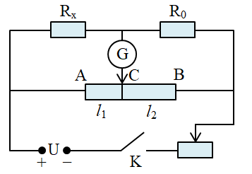 Hình bên là sơ đồ cầu Uyxtơn (Wheatstone) để đo \({R_x}\). AB là dây điện trở đồng chất hình trụ căng thẳng, \({R_0}\) đã biết. Khi di chuyển con chạy, tại vị trí \({I_G} = 0\), \(AC = {l_1}\), \(CB = {l_2}\). Tìm \({R_x}\).