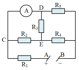 Cho mạch điện như hình vẽ: \({R_1} = {R_5} = 6\Omega \); \({R_2} = {R_3} = {R_4} = 8\Omega \). Điện trở