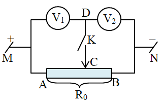 Trong hình vẽ dưới đây, biến trở có điện trở lớn nhất là \({R_0} = 6000\Omega \), các vôn kế có điện trở lần lượt là \({R_1} = 2000\Omega \); \({R_2} = 4000\Omega \). Điện trở của dây nối và khóa K không đáng kể. \({U_{MN}}\) không đổi và bằng 60V.