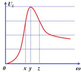 Đặt điện áp xoay chiều có giá trị hiệu dụng U không đổi vào hai đầu đoạn mạch AB mắc nối tiếp gồm cuộn dây thuần cảm có độ tự cảm L, điện trở thuần R và tụ điện có điện dung C. Tần số góc \(\omega \) của điện áp thay đổi được. Hình vẽ bên là đồ thị biểu diễn sự phụ thuộc của điện áp hiệu dụng trên cuộn dây thuần cảm theo giá trị tần số góc \(\omega \). Lần lượt cho \(\omega \) bằng x, y và z thì mạch AB tiêu thụ công suất lần lượt là \({P_1},{P_2}\) và \({P_3}\). Biểu thức đúng là