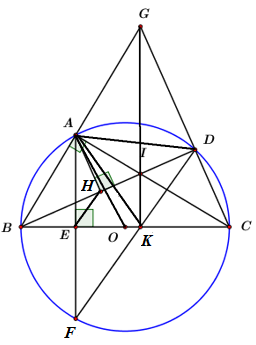 Cho \(\Delta ABC\,\,\,\left( {AB < AC} \right)\) nội tiếp đường tròn tâm \(O\) đường kính \(BC\) cố định, điểm \(D\) bất kì thuộc cung nhỏ \(AC\)\(\left( {D \ne A,\,\,D \ne C} \right).\) Tia \(BA\) cắt tia \(CD\) tại điểm \(G.\) Điểm \(I\) là giao điểm của \(BD\) và \(AC.\) Kẻ \(AE\) vuông góc với \(BC\) tại điểm \(E,\) đường thẳng \(AE\) cắt đường tròn \(\left( O \right)\) tại điểm thứ hai là \(F.\) Gọi \(H\) là hình chiếu vuông góc của điểm \(A\) trên \(BD,\,\,K\) là giao điểm của \(BC\) và \(DF.\) Chứng minh: