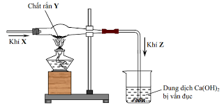 Hình vẽ sau đây mô tả thí nghiệm khí X tác dụng với chất rắn Y, nung nóng sinh ra khí Z:Hình