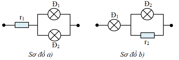 Có hai bóng đèn loại: Đ1: 120V – 100W; Đ2: 120V – 60W. Để sử dụng chúng vào mạng điện có hiệu điện thế 240V sao cho chúng sáng bình thường, người ta mắc chúng theo hai sơ đồ. Tìm: