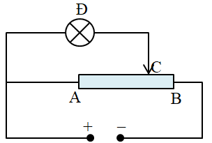 b) Nguồn điện cung cấp có hiệu điện thế 220V. Để đèn hoạt động bình thường, thì phải thiết lập sơ đồ mạch điện như hình vẽ. AB là một biến trở đồng chất, tiết diện đều. Cho điện trở của đoạn AC là \({R_{AC}} = 220\Omega \). Tính điện trở \({R_{CB}}\) của đoạn CB và tỉ số \(\dfrac{{AC}}{{CB}}\) là bao nhiêu?