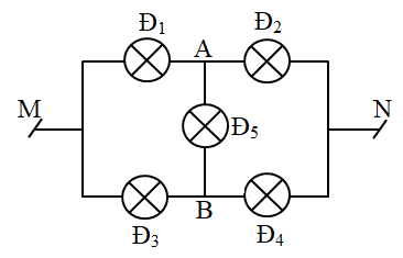 Cho mạch điện như hình vẽ, \({U_{MN}} = 5V\). Công suất tiêu thụ trên các đèn: \({P_1} = {P_4} = 4W\); \({P_2} = {P_3} = 3W\); \({P_5} = 1W\). Bỏ qua điện trở của các dây nối. Tính điện trở các bóng đèn và cường độ dòng điện qua mỗi đèn.