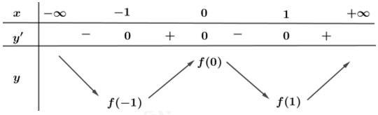 Cho hàm số bậc bốn trùng phương \(y = f\left( x \right)\) có đạo hàm \(f'\left( x \right) = 4{x^3} - 4x\). Giá trị nhỏ nhất của hàm số \(y = f\left( x \right)\) là