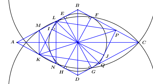 Cho hình thoi \(ABCD\,\,\left( {AC > BD} \right)\), \(O\) là giao điểm của \(AC\) và \(BD\). Đường tròn \(\left( O \right)\) nội tiếp hình thoi \(ABCD\), tiếp xúc với các cạnh \(AB,\,\,BC,\,\,CD,\,\,DA\) lần lượt tại các điểm \(E,\,\,F,\,\,G,\,\,H\). Lấy điểm \(K\) trên đoạn \(HA\) và \(L\) trên đoạn \(AE\) sao cho \(KL\) tiếp xúc với đườg tròn \(\left( O \right)\).