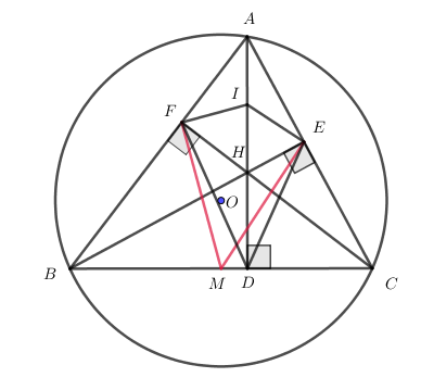 Cho tam giác nhọn ABC nội tiếp đường tròn \((O)\). Các đường cao AD, BE, CF (D thuộc B, E thuộc AC, F thuộc AB) của tam giác cắt nhau tại H, M là trung điểm của cạnh BC.