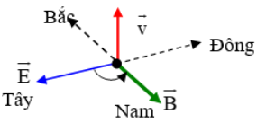 + Các vecto \(\vec E,\vec B,\overrightarrow v \) tuân theo quy tắc bàn tay trái: Xòe bàn tay trái, \(\vec E\) hướng theo chiều của 4 ngón tay, \(\vec B\) hướng vào lòng bàn tay, \(\overrightarrow v \) hướng theo chiều ngón tay cãi choãi ra.