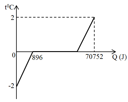 Sự biến thiên nhiệt độ của khối nước đá đựng trong ca nhôm theo nhiệt lượng cung cấp được cho trên đồ thị. Tìm khối lượng nước đá và khối lượng ca nhôm. Cho cnước = 4200 J/kg.K; cnước đá = 1800 J/kg.K; cnhôm = 880 J/kg.K; λnước đá = 3,4.105 J/kg.