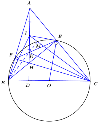 3) Vẽ \(CI\) cắt đường tròn \(\left( O \right)\) tại \(M\left( {M \ne C} \right)\), \(FE\) cắt \(AD\) tại \(K\). Chứng minh \(B,K,M\) thẳng hàng.
