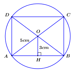 Cho đường tròn \(\left( C \right)\) tâm \(O\) bán kính \(R = 5\,\,cm\), vẽ dây cung \(AB\) của đường tròn \(\left( C \right)\) sao cho khoảng cách từ tâm \(O\) đến \(AB\) là \(3\,\,cm\). Tính diện tích hình chữ nhật nội tiếp đường tròn \(\left( O \right)\) có một cạnh là dây cung \(AB\).