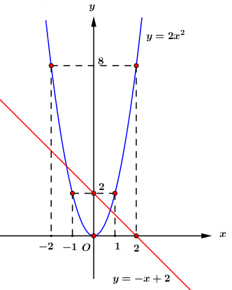 Vẽ đồ thị các hàm số \(y = 2{x^2}\) và đường thẳng \(y = - x + 2\) trên cùng mặt phẳng