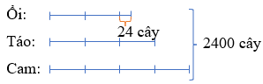 Vườn cây ăn quả nhà ông Năm trồng 2400 cây ăn quả gồm ổi, cam và táo. Số cây táo bằng \(\dfrac34\) số cây cam, số cây ổi nhiều hơn một nửa số cam là 24 cây. Hỏi mỗi loại có bao nhiêu cây?