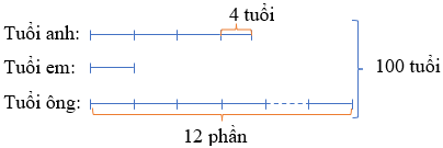 1 thế kỉ = 100 năm nên tổng số tuổi của ba ông cháu là 100 tuổi, vì tuổi của ông đúng bằng số tháng của em nên tuổi ông gấp 12 lần tuổi em, ta vẽ sơ đồ của bài toán rồi tính tuổi của mỗi người.