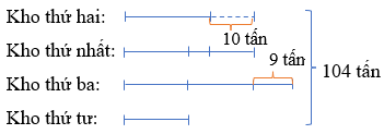 Tính tổng số thóc ở 4 kho, sau đó vẽ sơ đồ của bài toán, nếu kho thứ hai có thêm 10 tấn, kho thứ ba bớt đi 9 tấn thì số thóc ở kho thứ nhất, kho thứ hai và kho thứ ba bằng nhau và gấp đôi số thóc ở kho thứ hai, từ đó ta tính được số thóc mỗi kho sau khi chuyển, rồi tính được số thóc ban đầu ở từng kho.