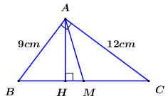 Cho tam giác \(ABC\) vuông tại \(A\) có đường cao \(AH\) và đường trung tuyến \(AM\). Biết \(AB = 9\,\,cm\), \(AC = 12\,\,cm\). Hãy tính \(BC,\,\,AH,\,\,AM\) và diện tích tam giác \(ABM\).