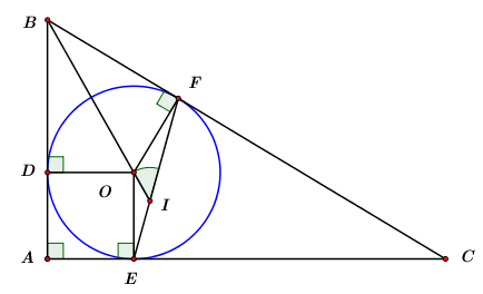 Cho \(\Delta ABC\) vuông tại \(A\) ngoại tiếp đường tròn \(\left( O \right).\) Gọi \(D,\,\,E,\,\,F\) lần lượt là các tiếp điểm của \(\left( O \right)\) với các cạnh \(AB,\,\,AC\) và \(BC.\) Đường thẳng \(BO\) cắt đường thẳng \(EF\) tại \(I.\) Tính \(\angle BIF.\)