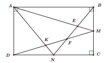 Cho hình chữ nhật \(ABCD.\) Gọi \(M,\,\,N\) lần lượt là trung điểm của các cạnh \(BC\) và \(CD.\) Gọi \(E\) là giao điểm của \(BN\) với \(AM\) và \(F\) là giao điểm của \(BN\) với \(DM;\,\,DM\) cắt \(AN\) tại\(K.\) Chứng minh điểm \(A\) nằm trên đường tròn ngoại tiếp tam giác \(EFK.\)