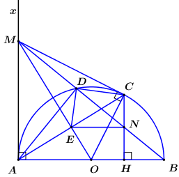 Cho nửa đường tròn \(\left( O \right)\) đường kính \(AB\). Vẽ tia tiếp tuyến \(Ax\) cùng phía với nửa đường tròn đường kính \(AB\). Lấy một điểm \(M\) trên tia \(Ax\,\,\left( {M \ne A} \right)\). Vẽ tiếp tuyến \(MC\) với nửa đường tròn \(\left( O \right)\) (\(C\) là tiếp điểm). Vẽ \(AC\) cắt \(OM\) tại \(E\), vẽ \(MB\) cắt nửa đường tròn tại \(D\,\,\left( {D \ne B} \right)\).