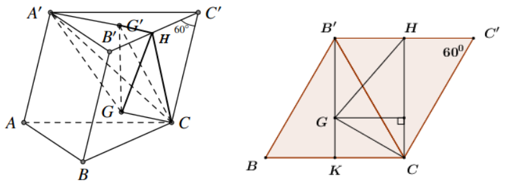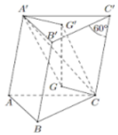 Cho hình lăng trụ \(ABC.A'B'C'\) có thể tích \(V\). Biết tam giác \(ABC\) là tam giác đều cạnh \(a\), các mặt bên là hình thoi, \(\angle CC'B' = {60^0}\). Gọi \(G;G'\) lần lượt là trọng tâm của tam giác \(BCB'\)và tam giác \(A'B'C'\). Tính theo \(V\)thể tích của khối đa diện \(GG'CA'\)